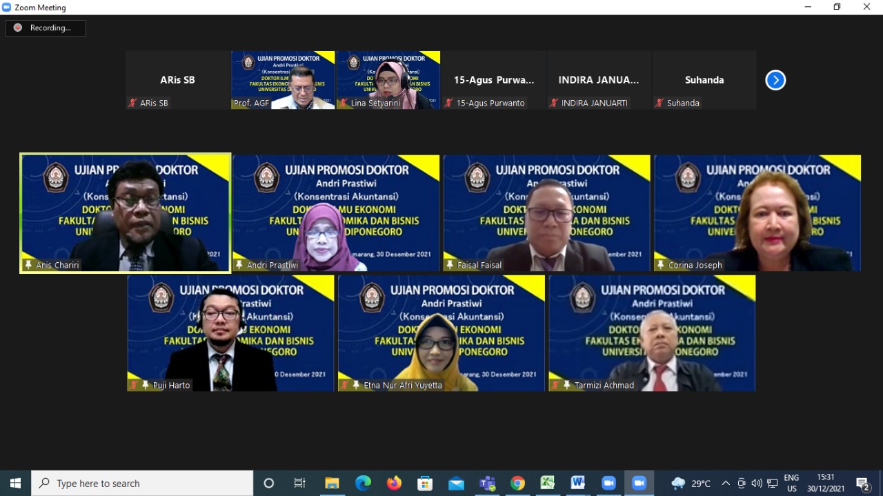 The Doctoral Program in Economics Faculty of Economics and Business Universitas Diponegoro on December 30, 2021 at 15.30 held a virtual doctoral promotion (VIVA exam) for Andri Prastiwi to defend his dissertation entitled “Antecedents and Consequences of Impression Management in Disclosure of Social Responsibility of Public Companies in Indonesia”. The Examination Committee consists of Prof. Anis Chariri, SE, M.Com, Ph.D, Ak, CA, CFrA (Chief Examiner), Prof. Faisal, SE., M.Si., Ph.D (Secretary Examiner, Main Supervisor), Prof. Corina Joseph (External Examiner), Prof. Drs. Tarmizi Achmad, M.B.A (Examiner), Puji Harto, SE, Akt., M.Si., Ph.D (Examiner) and Dr. Etna Nur Afri Yuyetta, SE, Akt, M.Si (examiner, co-Supervisor). The Viva exam run two hours and after assessing the dissertation, the Committee decided to award the candidate with PhD title. Congratulation and wish you success in the future career.
