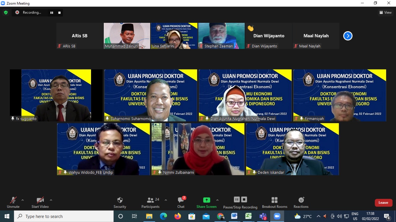 The Doctoral Program in Economics Faculty of Economics and Business Universitas Diponegoro on Februari 02, 2022 at 15.30 held a virtual doctoral promotion (VIVA exam) for Lisa Kartikasari defend her dissertation entitled ” Mini Purse Seine Fleet Strategic Interactions The Game Theory Model Approach “. The Examination Committee consists of Prof. Dr. Suharnomo, SE, M.Si (Chief Examiner, Main Supervisor), Prof. Dr. Fransiscus Xaverius Sugiyanto, M.S (Secretary Examiner, co-Supervisor), Dr. Nimmi Zulbainarni, SPi, MSi (External Examiner), Firmansyah,SE,M.Si.,Ph.D (Examiner), Wahyu Widodo, S.E., M.Si., Ph.D (Examiner) dan Dr. agr. Deden Dinar Iskandar,SE., M.A (Examiner). The Viva exam run two hours and after assessing the dissertation, the Committee decided to award the candidate with PhD title. Congratulation and wish you success in the future career.