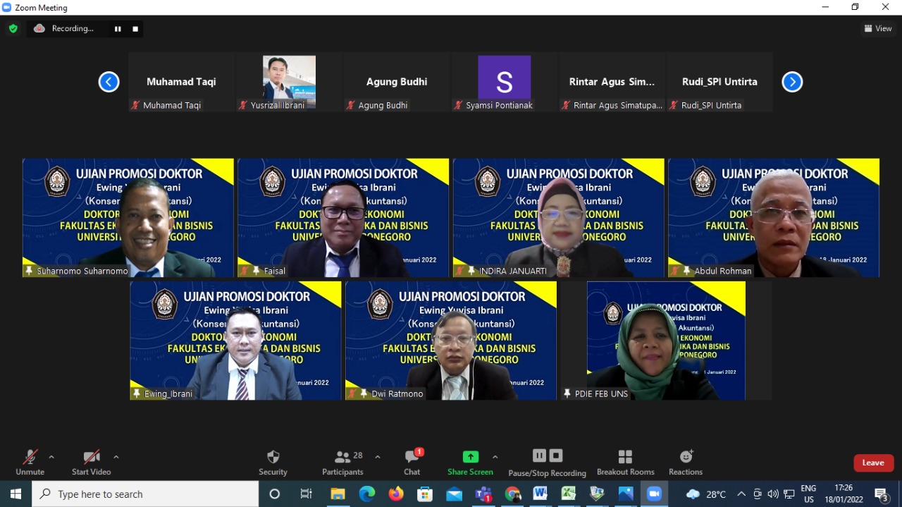 The Doctoral Program in Economics Faculty of Economics and Business Universitas Diponegoro on January 18, 2022 at 15.30 held a virtual doctoral promotion (VIVA exam) for Ewing Yuvisa Ibrani to defend his dissertation entitled “The Effectiveness of the Government’s Internal Control System in Preventing Fraud in the Procurement of Government Goods/Services”. The Examination Committee consists of Prof. Dr. Suharnomo, SE, M.Si (Chief Examiner), Prof. Faisal, SE, M.Si, PhD, CMA, CRP, CERG (Secretary Examiner, Main Supervisor), Prof. Dr. Rahmawati, M,Si., Ak (External Examiner), Prof. Dr. Abdul Rohman, M.Si, Akt (Examiner), Dr. Dwi Ratmono, SE, M.Si, Ak, CA (Examiner), and Prof. Dr. Indira Januarti, SE, M.Si, Ak, CA, CFrA (Examiner, co-Supervisor).The Viva exam run two hours and after assessing the dissertation, the Committee decided to award the candidate with PhD title. Congratulation and wish you success in the future career.