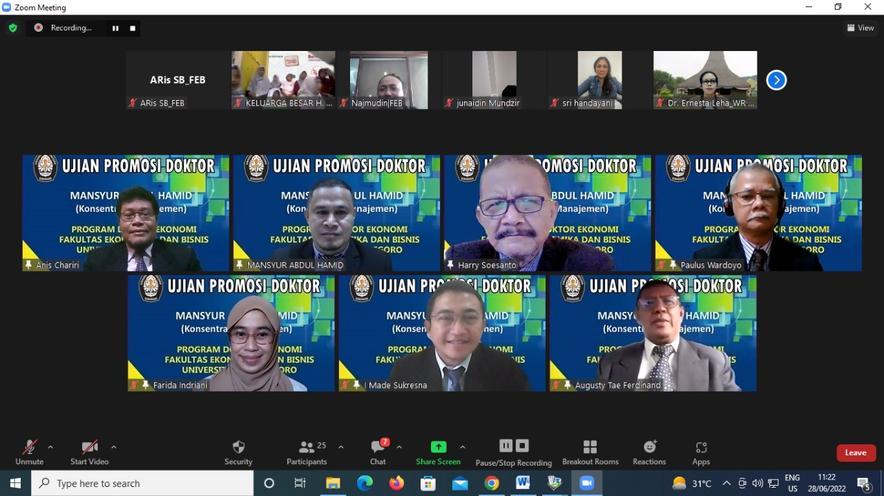 The Doctoral Program in Economics Faculty of Economics and Business Universitas Diponegoro on June 28, 2022 at 09.30 held a virtual doctoral promotion (VIVA exam) for Mansyur Abdul Hamid to defend his dissertation entitled “Ergo-Aesthetic Value Superiority : An SDL Theory Perspective to Improve Marketing Performance (Empirical Study on MSME Furniture Central Java)”. The Examination Committee consists of Prof. Anis Chariri, SE, MCom, PhD, Ak, CA (Chief Examiner, Examiner), Prof. Drs. Agusty Tae Ferdinand, MBA, DBA (Secretary Examiner, Main Supervisor), Dr. Paulus Wardoyo MM (External Examiner), Dr. Harry Soesanto, M.Kes (Examiner), I Made Sukresna, S.E., M.Si., Ph.D (Examiner) dan Dr. Farida Indriani, S.E., M.M (examiner, co-Supervisor). The Viva exam run two hours and after assessing the dissertation, the Committee decided to award the candidate with PhD title. Congratulation and wish you success in the future career.