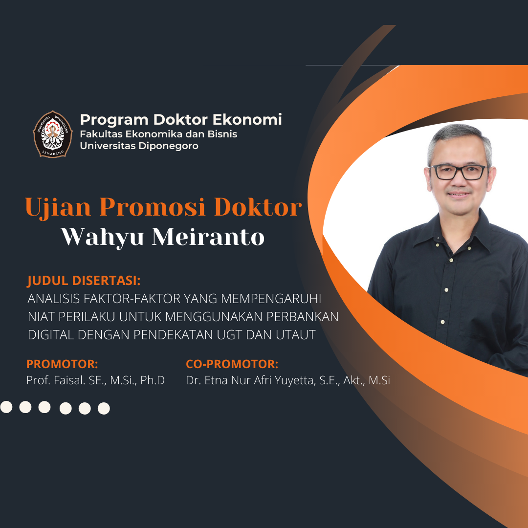 Program Doktor Ekonomi Fakultas Ekonomika dan bisnis UNDIP, Mengundang Bapak/Ibu/Saudara untuk mengikuti Ujian Promosi Doktor yang akan diselenggarakan pada:Hari, Tanggal : Rabu, 22 Mei 2024.